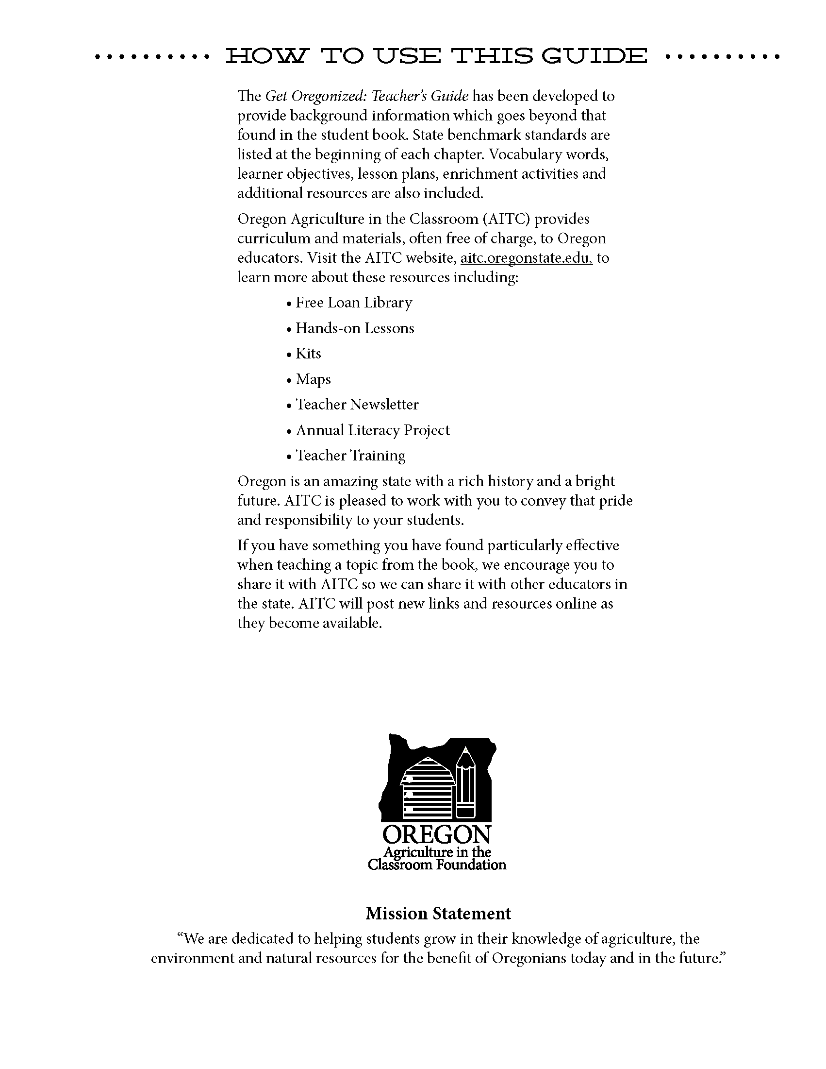 Get Oregonized is a history book written for students in grades three, four and five studying Oregon's history and regions. The text is designed to help students understand and appreciate the rich history, people and natural resources that shaped the state of Oregon. Maps, illustrations and photographs complement the easy to read text. Classroom sets or individual copies can be purchased through Oregon Agriculture in the Classroom Foundation.The 2013 version of Get Oregonized has an updated design and layout, new sections on potatoes and sheep, an updated forestry section, and several newly sourced historical and modern pictures. Both the student book and Teacher’s Guide have been updated and meet standards in social sciences for historical knowledge, geography, economics/finance, civics and government, mathematics, science and the arts.Get Oregonized is divided into two sections: Oregon's history and Oregon's geographic regions. The history section highlights various Native American tribes and the arrival of white people to the region. Students learn about famous explorers including Lewis and Clark, pioneers on the Oregon Trail, and about Oregon life through the eyes and words of children their own age. Important historical pioneer figures are featured including Henderson Luelling, Tabitha Brown, Asahel Bush, Asa Mead Simpson and Abigail Scott Duniway.The second half of the book explores the regions of the state. Students learn about Oregon's diverse geography, geology, climate, economy and agriculture. From cranberries on the southern Oregon coast to grass seed in the Willamette Valley, to wheat in the Columbia Plateau and ranching on Oregon's high desert, Get Oregonized captures the state's agricultural diversity.Get Oregonized was first written over 25 years ago. Oregon teachers wrote each chapter in the original book. AITC updated and reprinted the book in 2005, 2007 and has completed a fourth printing in 2013. Nearly 10,000 copies of the book are used in classrooms across the state.