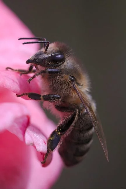 Yellow pollen-carrying hairs along the underbelly of a bee’s abdomen.
